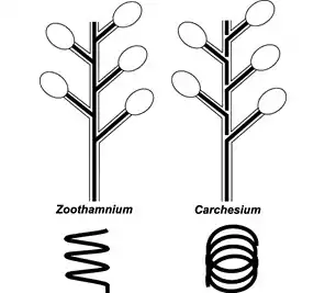 Ciliates that form branching colonies. The colonies can range in size from several zooids to hundreds of zooids depending on the species.[1] Bodies take on a conical to almost spherical shape and are attached posterior with a stalk to the main stalk. The stalk allows for multiple ciliates to come into contact with a feed source once detected, or move away from a potential hazard as needed. The anterior end of the ciliates is covered in circular rows of cilia known as the somatic girdle.[1] The main stalk that connects all of the ciliates branches is composed of a contractile spasmoneme, allowing stalk to contact as a single functioning unit.[1] When contracting the colony can reduce its size by folding in as a single unit in a zig zag fashion.[1] The protozoa can display polymorphism, or multiple physical forms of the same cell. Those on the stalks are shaped like rods, but those in the region of the ciliated oral apparatus of the zooids are shaped like small spheres.[6]