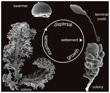 Initial colonization is established by swarmer cells. Once a somatic girdle or circular rows of cilia are developed, a mature macrozooid can leave the mother colony as a swarmer.[1] Once a suitable substrate is found, an initial segment of stalk is produced to attach the cell to the new colonization point.[1]