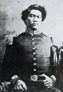 Kaʻauwai married Kalanikauleleiaiwi III, a high chiefess of the Maui lineage descended from Piʻilani, and a relative of the family of High Chief Hoapili.[27] His mother-in-law Marie Leahi was an early Roman Catholic female catechumen.[7] With Kalanikauleleiaiwi he had four children: three sons including David Kahalekula Kaʻauwai (1833–1856), William Hoapili Kaʻauwai (1835–1874), and George Kaleiwohi Kaʻauwai (1843–1883) and a daughter who died in infancy before 1848.[25] His eldest son David Kahalekula Kaʻauwai served alongside his father in the House of Representatives, from 1854 to 1855, and was considered "one of the finest Hawaiian orators".[28] His second son William Hoapili Kaʻauwai also served in the legislator as a Representative for Wailuku for two terms in 1862 and 1870. He became the only ordained Hawaiian Anglican priest and traveled with his wife Kiliwehi as part of the retinue of Queen Emma during her trip to Europe.[29] His youngest son George Kaleiwohi Kaʻauwai married Ulalia Muolo Keaweheulu Laʻanui, and their daughter was Princess Elizabeth Kahanu Kalanianaʻole, wife of Prince Jonah Kūhiō Kalanianaʻole, the second Congressional Delegate from the Territory of Hawaii.[30]