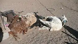 During the winter of 2009–2010, 80% of the country's territory was covered with a snow blanket of 200–600mm (7-24 inches).[10] In the Uvs aimag, extreme cold (night temperature of −48 °C / −54 °F) remained for almost 50 days.[11] 9,000 families lost their entire herds while a further 33,000 suffered 50% loss.[12] The Ministry of Food, Agriculture and Light Industry reported 2,127,393 head of livestock were lost as of 9 February 2010 (188,270 horse, cattle, camel and 1,939,123 goat and sheep).[10] The agriculture ministry predicted that livestock losses might reach four million before the end of winter;[13] however, by May 2010, the United Nations reported that eight million, or about 17% of the country's entire livestock, had died.[2]