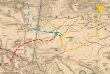 Chelmsford relieved the siege of Eshowe on 3 April and withdrew the Right Column back to the British Colony of Natal. He reorganised his forces into two main thrusts. The reinforced Right Column was re-designated the First Division and was tasked with a steady advance along the east coast. The survivors of the Centre Column were reinforced with the cavalry brigade and other fresh troops and became the Second Division that would advance on the Zulu capital Ulundi.[4] The Left Column, containing a high proportion of colonial irregular horse, which fought as mounted infantry, was re-designated as a flying column under Colonel Evelyn Wood.[5] Wood's column was to operate in conjunction with the Second Division, supporting its advance on Ulundi.[4][5]