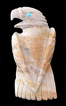 Zuni fetishes are small carvings made from primarily stone but also shell, fossils, and other materials by the Zuni people. Within the Zuni community, these carvings serve ceremonial purposes for their creators and depict animals and icons integral to their culture. As a form of contemporary Native American art, they are sold with secular intentions to collectors worldwide. Prior to the establishment of a non-Native market for fetishes, Hopi, Navajo, and other Pueblo peoples, especially at Kewa Pueblo also carved and used fetishes.[1]