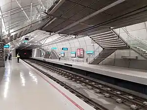 Zurbaranbarri follows the same cavern-like station layout shared by most underground stations of the system, designed by Norman Foster, with the main hall located suspended directly above the tracks.[2]