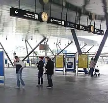The cantonal popular initiative "for moderate air traffic" submitted in January 1991 intended to limit the airport to its then status, i.e. neither to allow more aircraft movements nor to expand the infrastructure. In the vote of 26 September 1993, however, it did not stand a chance and was clearly rejected by 235,531 votes to 112,476 (67.6%).[33] Nine months later, Zürich's cantonal government submitted a proposal for a loan of CHF 873 million to the cantonal council. The fifth construction phase, known as "Airport 2000" and costing a total of CHF 2.4 billion, was intended to replace outdated systems and further expand existing facilities. At the heart of the project was the construction of a third terminal, Dock E "Midfield", located between the three runways. The Skymetro aerial tramway, a road tunnel and underground baggage conveyors were necessary for its development. Also part of the fifth stage was the construction of the new passenger hub "Airside Center". The Cantonal Council approved the project at the end of February 1995.[16] It cleared the last hurdle in the referendum of 25 June 1995, when it was approved by 224,668 votes to 105,859 (68.0% Yes).[33] After almost nine years of construction, the project was completed in 2004.