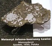 Łowicz is a stony-iron meteorite (mesosiderite) which fell on 12 March 1935 at 0:50 in the area of Krępa Rzeczyce and Wrzeczko villages, south of Łowicz. Numerous specimens were recovered.