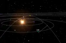 2001 FO32 is a member of the dynamical Apollo group of Earth-crossing near-Earth asteroids with orbital semi-major axes greater than 1 astronomical unit (AU).[3][1] It follows a highly elongated orbit around the Sun at a distance of 0.3–3.1 AU once every 2.22 years (810 days; semi-major axis of 1.7 AU). Its orbit has a high eccentricity of 0.83 and an inclination of 39° with respect to the ecliptic. With its highly eccentric orbit, it crosses the orbits of all four inner planets of the Solar System.[3]