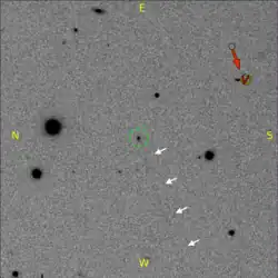![]() Cerro Tololo Observatory image of 2005 QN173 with a long, narrow tail (indicated with white arrows) on 22 July 2016 | |