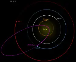 It is a Mercury-, Venus-, Earth- and Mars-crossing asteroid. With an observation arc of 14 years, it has a well determined orbit and was last observed in 2016.[3] It is classified as an Apollo asteroid[3] because it is a near-Earth asteroid with a semi-major axis larger than Earth's. It is also categorized as a potentially hazardous asteroid,[3] but that does not mean there is a near-term threat of an impact. It is a potentially hazardous asteroid merely as a result of its size (absolute magnitude H ≤ 22) and Earth minimum orbit intersection distance (Earth MOID ≤ 0.05 AU).