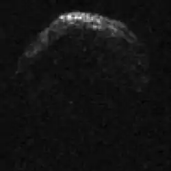 The studies showed that the asteroid has a mean diameter of 1.1 km, assuming that 1950 DA is a retrograde rotator.[18] Optical lightcurve analysis by Lenka Šarounová and Petr Pravec shows that its rotation period is 2.1216±0.0001 hours. Due to its short rotation period and high radar albedo, 1950 DA is thought to be fairly dense (more than 3.5 g/cm3, assuming that it has no internal strength) and likely composed of nickel–iron.[4] In August 2014, scientists from the University of Tennessee determined that 1950 DA is a rubble pile rotating faster than the breakup limit for its density, implying the asteroid is held together by van der Waals forces rather than gravity.[19][20]