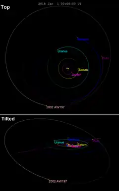 2002 AW197 orbits the Sun at a distance of 40.9–53.2 AU once every 322.6 years (over 117,800 days; semi-major axis of 47 AU). Its orbit has an eccentricity of 0.13 and an inclination of 24° with respect to the ecliptic.[3] The body's observation arc begins with a precovery taken at Haleakala-NEAT/GEODSS (566) in December 1997, more than 4 years prior to its official discovery observation at Palomar.[1] At 45.4 AU from the Sun,[19] it continues to slowly approach the Sun until its perihelion passage at 41.1 AU in May 2078.[7]