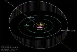 (90568) 2004 GV9 is a trans-Neptunian object that was discovered on April 13, 2004 by NEAT.[1] It has been listed as a cubewano by the Minor Planet Center.[2] It was discovered on 13 April 2004 by NEAT. It has been observed forty-seven times, with precovery images back to 1954.[4] The object has an orbital period of 273.88 years. Its maximum possible distance from the Sun (aphelion) is 45.62 AU, and its closest (perihelion) is 38.7 AU, and currently 39.7 AU from he sun. It has an inclination of 21.9718, and eccentricity of 0.082.