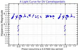 15 Camelopardalis is a triple star[5] system in the northern circumpolar constellation of Camelopardalis. It has the variable star designation DV Camelopardalis; 15 Camelopardalis is the Flamsteed designation. This is just visible to the naked eye as a dim, blue-white hued star with a baseline apparent visual magnitude of 6.13.[3] It is a probable (99%) member of the Cas-Tau OB association.[5]