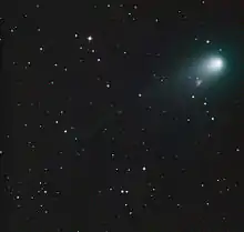 The comet came to perihelion on October 1, 2012,[3] and was expected to reach about apparent magnitude 15.2, but due to an outburst the comet reached apparent magnitude 8.[5] As a result of the outburst of gas and dust, the comet was briefly more than 500 times brighter than it would have been without the outburst.[6] On October 19, 2012, images by the Virtual Telescope Project showed a dust cloud trailing the nucleus.[7] Images by the 2 m (79 in) Faulkes Telescope North on October 26, 2012, confirm a fragmentation event.[8] The secondary fragment was about magnitude 17. Further observations by the 8.1 m (320 in) Gemini telescope show that the comet fragmented into at least four parts.[9]