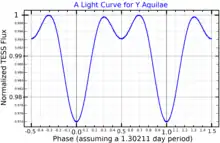 18 Aquilae (abbreviated 18 Aql) is a triple star[9] system in the constellation of Aquila. 18 Aquilae is the Flamsteed designation; it also bears the variable star designation Y Aquilae. It has an apparent visual magnitude of 5.07. The distance to this system can be estimated from the annual parallax shift of 6.43 mas, yielding a value of around 510 light-years (160 parsecs) away from Earth.