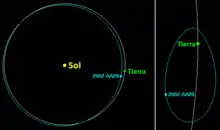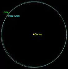 2002 AA29 (also written 2002 AA29) is a small near-Earth asteroid that was discovered on January 9, 2002 by the LINEAR (Lincoln Near Earth Asteroid Research) automatic sky survey. The diameter of the asteroid is only about 20–100 metres (70–300 ft). It revolves about the Sun on an almost circular orbit very similar to that of the Earth. This lies for the most part inside the Earth's orbit, which it crosses near the asteroid's furthest point from the Sun, the aphelion. Because of this orbit, the asteroid is classified as Aten type,[2] named after the asteroid 2062 Aten.