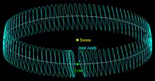 Because of its orbital inclination of 10.739° to the ecliptic, 2002 AA29 is not always forced by the Earth on its horseshoe orbit however but can sometimes slip out of this pattern. It is then caught for a while in the neighbourhood of the Earth. This will next happen in about 600 years i.e. in the 26th century. It will then stay within the small gap in the Earth's orbit which it does not reach in its previous horseshoe orbit, and will be no further than 0.2 astronomical units (30 million km) away from the Earth. There it will slowly circle the Earth almost like a second moon, although it takes one year for a circuit. After 45 years it finally switches back into the horseshoe orbit, until it again stays near the Earth for 45 years around the year 3750 and again in 6400. In these phases in which it stays outside its horseshoe orbit it oscillates in the narrow region along the Earth's orbit where it is caught, moving back and forth in 15 years. Because it is not bound to the Earth like the Moon but is mainly under the gravitational influence of the Sun, it belongs to the bodies called quasi-satellites. This is somewhat analogous to two cars travelling side by side at the same speed and repeatedly overtaking one another but which are however not attached to each other. Orbital calculations show that 2002 AA29 was in this quasi-satellite orbit for 45 years from about 520 AD but because of its tiny size was too dim to have been seen. It switches approximately cyclically between the two orbital forms, but always stays for 45 years in the quasi-satellite orbit. Outside the time frame from about 520-6500 AD, the calculated orbits become chaotic i.e. not predictable, and thus for periods outside this time frame no exact statements can be made.[7] 2002 AA29 was the first known heavenly body that switches between horseshoe and quasi-satellite orbits.