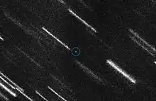 The asteroid remained too faint to be recovered with automated astronomical surveys until early September,[20] but a more targeted observation with the Very Large Telescope recovered it on 27 July 2017 at apparent magnitude 26.8, while the asteroid was 0.4 AU (60,000,000 km; 37,000,000 mi) from Earth, making it one of the dimmest asteroid recoveries ever. As such, 2012 TC4 has become the first known asteroid ever to be observed passing less than 1 Lunar distance from Earth twice in a row.[21] At the time of recovery the asteroid was about 100 million times fainter than what can be seen with the naked eye[22] and 500 times fainter than when it was discovered in 2012. As a result of the 2017 recovery observations, it was known that on 12 October 2017 at 5:42 UT, the asteroid would pass 0.0003352 AU (50,150 km; 31,160 mi) from Earth.[2] Then at 19:19 UT, the asteroid would pass 0.001856 AU (277,700 km; 172,500 mi) from the Moon.[2] 2012 TC4 peaked at about apparent magnitude 12.9,[23] and was too faint to be seen without a telescope. The Earth approach of 2017 increased the asteroid's orbital period from 1.67 years to 2.06 years.[24]