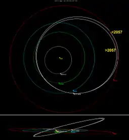On 27 January 2018 Pan-STARRS precovery images from November and December 2011 were announced,[7][1][8] and 2017 XO2 was removed from the Sentry Risk Table. These precovery images extended the observation arc from 40 days to 6.21 years. It is now known that on 26 April 2057 the asteroid will be just past closest approach roughly 0.056 AU (8,400,000 km; 5,200,000 mi) from Earth with a 3-sigma uncertainty of ±3000 km.[3][9]