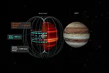 The wind speed is directly inferred from minute, regular cycles in its visible (which matches its ultra-violet) appearance compared to the same at radio wave spectra.[6][7][8][9] The radio emissions are coming from electrons interacting with the magnetic field, which is rooted deep in the interior.[8] The visible and infrared (IR) data, on the other hand, reveal what's happening in the gas giant's cloud tops.[8]