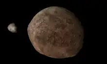 The satellite is 1.4 magnitudes dimmer than Huya (HV=5.04),[48] giving a visual absolute magnitude of 6.44 for the satellite.[6][lower-alpha 6] The satellite is relatively large compared to Huya, being slightly larger than half the primary's diameter of 406 km (252 mi).[9][6] The size ratio of the satellite to the primary is 0.525.[9] The large size ratio is analogous to the Pluto–Charon binary system, in which Pluto's large moon Charon is large and massive enough such that the center of mass (barycenter) is located in the space between Charon and Pluto.[49][8] The Huya system may be in a similar case, although no information about its barycenter is known.[8] With a large size compared to Huya, the satellite is expected to have slowed Huya's rotation such that both components become mutually tidally locked,[8] although several photometric observations of Huya indicate a rotation period of several hours, suggesting that Huya may not be tidally locked to its satellite.[11][10] If Huya is not tidally locked to its satellite, this implies that the satellite could have a very low density of around 0.5 g/cm3, which would result in a longer time for both components to become mutually tidally locked.[8]