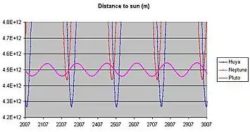 Huya is in a 2:3 mean-motion orbital resonance with Neptune, meaning that Huya completes two orbits around the Sun for every three orbits completed by Neptune.[34] Due to its 2:3 orbital resonance with Neptune, Huya is classified as a plutino, a dynamical class of objects with orbits similar to that of Pluto.[21] Huya orbits the Sun at an average distance of 39.8 AU (5.95×109 km), taking 250 years to complete a full orbit.[1] Huya's orbit is inclined to the ecliptic by 15.5 degrees, slightly less than Pluto's orbital inclination of 17 degrees.[1][35] It has an elongated orbit with an orbital eccentricity of 0.28. Due to its eccentric orbit, its distance from the Sun varies over the course of its orbit, ranging from 28.5 AU at perihelion (closest distance) to 51.1 AU at aphelion (farthest distance).[1] Like Pluto, its resonance with Neptune prevents close approaches between Huya and the giant planets.[36] The minimum orbit intersection distance (MOID) between Huya and Neptune is 1.45 AU,[4] but due to the resonance, the two never come closer than 21 AU of each other.