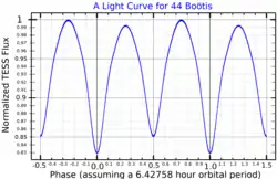 The primary component, 44 Boötis A, is a yellow-white G-type main sequence dwarf with a mean apparent magnitude of +4.83. The companion component, 44 Boötis B, is a W Ursae Majoris variable spectroscopic binary. The variability of this star system was discovered by English astronomer William Herschel.[17] The brightness of the eclipsing binary varies from magnitude +5.8 to +6.40 with a period of 6.43 hours.[18] The two eclipsing components of the system are close enough to allow their stellar envelopes to overlap, or at least nearly so.[10]