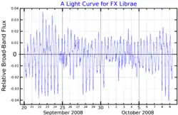 48 Librae is a single[5] shell star in the constellation Libra. It is a variable star with the designation FX Lib, ranging in magnitude from 4.74 to 4.96.[6] Based upon an annual parallax shift of 6.97±0.24 mas as seen from Earth's orbit, it is located around 470 light years from the Sun. It is a candidate member of the Upper Scorpius group of the Scorpius–Centaurus association, with the former having an age of about 11 million years.[10]