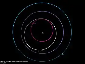 The orbit of ꞌAylóꞌchaxnim is well-secured with an uncertainty parameter of 2.[3][4] The asteroid orbits the Sun in approximately 151 days (0.41 years), with a semi-major axis of approximately 0.5554 AU.[4] 2020 AV2's orbit is close to a 3:2 mean-motion orbital resonance with Venus, meaning that ꞌAylóꞌchaxnim completes approximately three orbits for every two orbits completed by Venus.[19] The orbit of ꞌAylóꞌchaxnim is moderately eccentric, as it approaches only 0.457 AU from the Sun at perihelion, just within Mercury's aphelion distance of 0.467 AU.[3] ꞌAylóꞌchaxnim's orbit is also moderately inclined to the ecliptic by approximately 15.9 degrees.[3][10] ꞌAylóꞌchaxnim has a smaller orbital eccentricity and inclination compared to the generally expected values for typical Vatira asteroids, which were predicted to have an eccentricity around 0.4 and an inclination around 25 degrees.[19] The asteroid's minimum orbit intersection distance from Mercury and Venus is about 0.066 AU (9.9×106 km) and 0.079 AU (11.8×106 km), respectively.[4]
