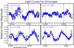 - Zhiping, Li (October 2000). "Complicated pulsation in the delta Scuti variable 59 Aurigae". Astronomy and Astrophysics. 362: 595–598. Bibcode:2000A&A...362..595L. Retrieved 31 October 2021.