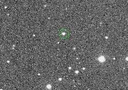 69230 Hermes is a sub-kilometer sized asteroid and binary system on an eccentric orbit,[10] classified as a potentially hazardous asteroid and near-Earth object of the Apollo group, that passed Earth at approximately twice the distance of the Moon on 30 October 1937. The asteroid was named after Hermes from Greek mythology.[3] It is noted for having been the last remaining named lost asteroid, rediscovered in 2003. The S-type asteroid has a rotation period of 13.9 hours.[7] Its synchronous companion was discovered in 2003. The primary and secondary are similar in size; they measure approximately 810 meters (2,700 ft) and 540 meters (1,800 ft) in diameter, respectively.[5]