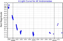 The star was discovered to be variable in 1927, with a photographic magnitude range of 15.3 to 16.5, at the Harvard College Observatory and designated HV 4013. It was considered to be the brightest variable star in M31[9][10] Two years later it was given the variable star designation AF Andromedae.[11] Between 1917 and 1953, five or six major eruptions were detected and two or three minor ones. More eruptions were observed in 1970-74, 1987-92, 1998-2001, [8] and 2017.[12]
