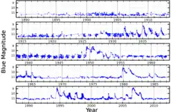 Every 12-16 years, outbursts occur and last for several years.[5] The brightness can increase to visual magnitude 7.9,[3] although usually not this bright.[5]