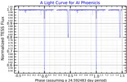 AI Phoenicis is a variable star in the constellation of Phoenix. An Algol-type eclipsing binary, its apparent magnitude is constant at 8.58 for most of the time, sharply dropping to 9.35 during primary eclipse and to 8.89 during secondary eclipse.[3] The system's variability was discovered by W. Strohmeier in 1972.[9] From parallax measurements by the Gaia spacecraft, the system is located at a distance of 560 light-years (171 parsecs) from Earth,[2] in agreement with earlier estimates based on its luminosity (173 ± 11 parsecs).[4]