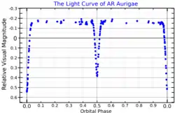 Both components are blue-white B-type main-sequence stars that do not fill their Roche lobes. The system has a mean apparent magnitude of +6.15. However, the orbit of the stars are oriented in such a way that they periodically eclipse each other, so AR Aurigae is a variable star and its brightness varies from magnitude +6.15 to +6.82 with a period of 4.13 days.[6]