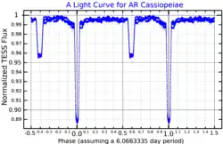 AR Cassiopeiae (AR Cas) is a variable star in the constellation of Cassiopeia. It is thought to be a member of a septuple star system, one of only two known star systems with a multiplicity of 7, the other being Nu Scorpii.[12][9]