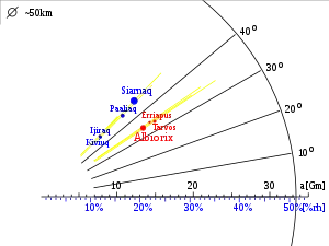 Albiorix orbits Saturn at a distance of about 16 million kilometers. The rotation period was measured by the ISS camera of the Cassini spacecraft to 13 hours and 19 minutes.[13]