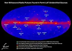 In a span of three months seventeen pulsars - millisecond pulsars - were discovered in the Milky Way galaxy. Unknown high-energy sources detected by NASA's Fermi Gamma-ray Space Telescope revealed the existence and location of the pulsars. This is an accelerated pace for discovering such objects, which could be used as a "galactic GPS" to detect gravitational waves passing near Earth. Although the pulsars are relatively old they have not slowed because, these millisecond pulsars have been kept rapidly rotating and renewed with material by accretion of matter from a companion star. The combined total of 60 known millisecond pulsars creates an all-sky array. Precise monitoring of timing changes, utilizing this array, may allow the first direct detection of gravitational waves.[1]