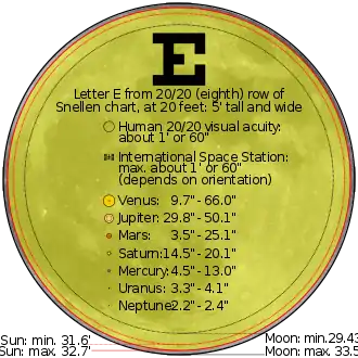 The angular diameter, angular size, apparent diameter, or apparent size is an angular distance describing how large a sphere or circle appears from a given point of view. In the vision sciences, it is called the visual angle, and in optics, it is the angular aperture (of a lens). The angular diameter can alternatively be thought of as the angular displacement through which an eye or camera must rotate to look from one side of an apparent circle to the opposite side. Humans can resolve with their naked eyes diameters of up to about 1 arcminute (approximately 0.017° or 0.0003 radians).[1] This corresponds to 0.3 m at a 1 km distance, or to perceiving Venus as a disk under optimal conditions.