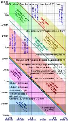 | Maximum resolvable diameter by Galileo Galilei's largest 38mm refracting telescopes | ~1″ | ;[14] Note: 30x[15] magnification, comparable to very strong contemporary terrestrial binoculars |