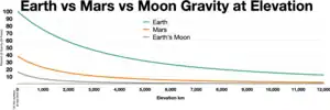 The gravity of Mars is a natural phenomenon, due to the law of gravity, or gravitation, by which all things with mass around the planet Mars are brought towards it. It is weaker than Earth's gravity due to the planet's smaller mass. The average gravitational acceleration on Mars is 3.72076 ms−2 (about 38% of that of Earth) and it varies.[1] In general, topography-controlled isostasy drives the short wavelength free-air gravity anomalies.[2] At the same time, convective flow and finite strength of the mantle lead to long-wavelength planetary-scale free-air gravity anomalies over the entire planet.[3][4] Variation in crustal thickness, magmatic and volcanic activities, impact-induced Moho-uplift, seasonal variation of polar ice caps, atmospheric mass variation and variation of porosity of the crust could also correlate to the lateral variations.[5][6][7][8][9] Over the years models consisting of an increasing but limited number of spherical harmonics have been produced. Maps produced have included free-air gravity anomaly, Bouguer gravity anomaly, and crustal thickness. In some areas of Mars there is a correlation between gravity anomalies and topography. Given the known topography, higher resolution gravity field can be inferred. Tidal deformation of Mars by the Sun or Phobos can be measured by its gravity. This reveals how stiff the interior is, and shows that the core is partially liquid. The study of surface gravity of Mars can therefore yield information about different features and provide beneficial information for future landings.