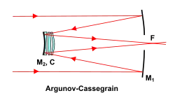 The Argunov–Cassegrain telescope is a catadioptric telescope design first introduced in 1972 by P. P. Argunov.[1][2] All optics are spherical, and the classical Cassegrain secondary mirror is replaced by a sub-aperture secondary corrector group consisting of three air-spaced elements, two lenses and a Mangin mirror (the element farthest from the primary mirror).