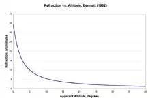 Bennett[20] developed another simple empirical formula for calculating refraction from the apparent altitude which gives the refraction R in arcminutes: