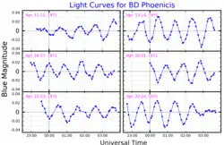 BD Phoenicis is a Lambda Boötis star, an uncommon type of peculiar stars that have very low abundances of iron-peak elements. In particular, BD Phoenicis has near-solar carbon and oxygen content, but its iron abundance is only 4% the solar value.[1] BD Phoenicis is also a pulsating variable of Delta Scuti type, varying its apparent magnitude between 5.90 and 5.94.[3] A study of its light curve detected seven pulsation periods that range from 50 to 84 minutes, the strongest one having a period of 57 minutes and an amplitude of 9 milli-magnitudes. Pulsations are common among Lambda Boötis star and seem to be more common than on normal main sequence stars of the same spectral type.[1]