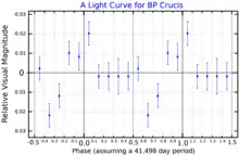 BP Crucis is considered as the optical counterpart to the X-ray source GX 301-2. The system consists of a massive hypergiant star and a neutron star in an eccentric 41.5 day orbit. The distance is likely to be between three and four thousand parsecs. It is heavily reddened and has a K-band infrared magnitude of 5.72.[2]