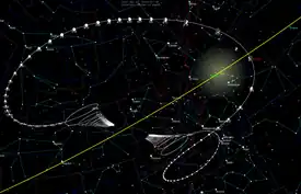 During January to March 2020, the comet was located in the constellation of Ursa Major. Throughout the month of April, the comet was in the constellation of Camelopardalis. On May 12 it moved into Perseus. It was 0.78 AU (117 million km; 300 LD) from Earth on May 23 during a new moon when the comet was 17 degrees from the Sun. At its perihelion on May 31, it was in the Taurus constellation 12 degrees from the Sun.[29] Then, through June and July, it passed through Orion and Monoceros.