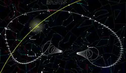 The Minor Planet Center initially listed the orbit as bound with .[2] With a short 18-day observation arc JPL listed the comet as hyperbolic with an eccentricity of 1.0009±0.001, but a longer observation arc was needed to refine the uncertainties and either confirm its hyperbolic trajectory, or determine its orbital period of thousands or millions of years.[9] With a 40-day observation arc it was possible to determine that it came from the Oort cloud on a Hyperbolic trajectory and that the outbound orbit will last ~11,000 years.