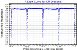 CM Draconis (GJ 630.1A) is an eclipsing binary system approximately 47 light-years away[2] in the constellation of Draco (the Dragon). The system consists of two nearly identical red dwarf stars located in the constellation Draco. The two stars orbit each other with a period of 1.27 days with a separation of 2.7 million kilometres (0.018 AU).[4] Along with two stars in the triple system KOI 126, the stars in CM Draconis are the lightest stars with precisely measured masses and radii. Consequently, the system plays an important role in testing stellar structure models for very low mass stars.[5] These comparisons find that models underpredict the stellar radii by approximately 5%. This is attributed to consequences of the stars' strong magnetic activity.