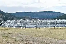 In 2013, the CHIME Pathfinder telescope was built, also at DRAO.[13] It is a smaller-scale version of the full instrument, consisting of two, 36 x 20 metre semi-cylinders populated by 128 dual-polarization antennas, and is currently being used as a testbed for CHIME technology and observing techniques. Additionally, the Pathfinder will also be capable of making an initial measurement of the baryon acoustic oscillations (BAO) with the intensity mapping technique and will become a useful telescope in its own right.