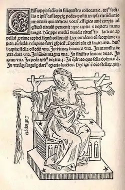 Poseidon thought Cassiopeia should not escape punishment, so he placed her in the heavens chained to a throne in a position that referenced Andromeda's ordeal. The constellation resembles the chair that originally represented an instrument of torture. Cassiopeia is not always represented tied to the chair in torment; in some later drawings she holds a mirror, symbol of her vanity, while in others she holds a palm frond.[6][7][8]
