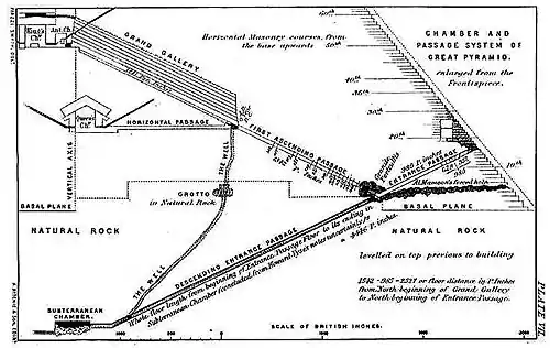 Smyth subsequently published his book Our Inheritance in the Great Pyramid in 1864[2] (which he expanded over the years and is also titled The Great Pyramid: Its Secrets and Mysteries Revealed). Smyth claimed that the measurements he obtained from the Great Pyramid of Giza indicated a unit of length, the pyramid inch, equivalent to 1.001 British inches, that could have been the standard of measurement by the pyramid's architects. From this he extrapolated a number of other measurements, including the pyramid pint, the sacred cubit, and the pyramid scale of temperature.